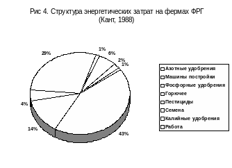 Г. Кант (1988) приводит данные о энергетических затратах на фермах ФРГ (рис. 5). Основным потребителем энергии являются производство азотных удобрений (43% от общих энергозатрат на сельскохозяйственное производство) и горючее (29 % от общих энергозатрат). Максимальную экономию энергии могли бы обеспечить: 1) биологическое связывание азота вместо химико-технического;
