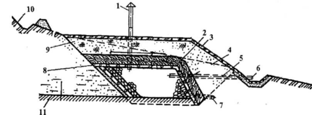 1 - вентиляційна труба; 2 - утрамбований глинистий ґрунт; 3 - укріплення рослинним ґрунтом; 4 - кам'яний накид; 5 - переливна труба; 6 - латунна сітка; 7 - витратна труба; 8 - гравійний захисний шар; 9 - насипний ґрунт; 10 - нагірна канава; 11 - водотривкий пласт