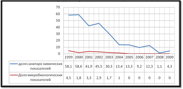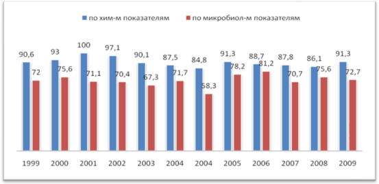 Рис. 9 Кол-во колодцев с несоответствующей санитарным нормам водой (в %) за период 1999 – 2009гг.