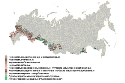 Среди земель, наиболее полно испытывающих на себе влияние хозяйственной деятельности человека, находятся южные и центральные районы России (рис 3). Эти земли относятся к территориям с острой экологической ситуацией. Динамика развития деградационных процессов здесь отличается большой скоростью и, на некоторых участках, фактической необратимостью нарушения почвенного покрова. Если сравнить карту России с нанесенными на ней границами районов с острыми экологическими ситуациями и карту почвенного покрова, то можно заметить, что в число неблагоприятных территории попадает фактически весь черноземный юг России (рис. 4). К числу таких субъектов России следует отнести:
