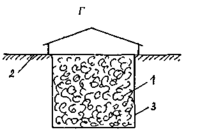 A — отвальный тип захоронения; Б — захоронение на склонах; В — захоронение в котлованах; Г — захоронение в подземном бункере; 1 — отходы; 2— гидроизоляция; 3— бетон