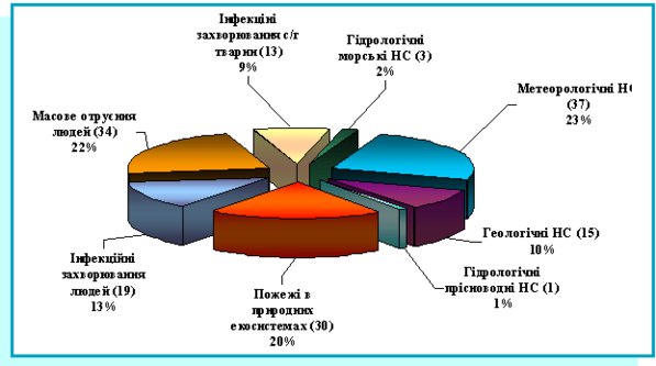 За видами надзвичайні ситуації розподілилися таким чином: метеорологічні - 23%; отруєння населення - 22%; пожежі в природних екосистемах - 20%; інфекційні захворювання людей - 13%; геологічні - 10%; інфекційні захворювання с/г тварин - 9%; гідрологічні морські - 2%; гідрологічні прісноводні - 1% (рис. 3.1). За масштабами більшість НС природного характеру віднесені до об'єктового (73) та місцевого (53) рівнів, 21 НС віднесено до регіонального, 5 НС - до державного рівнів.