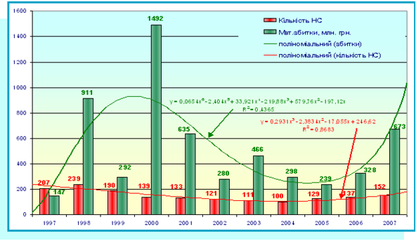 За попередніми даними протягом 2007 року НС природного характеру було завдано збитків на суму близько 673,3 млн. гривень, що вдвічі більше проти 2006 року (рис. 3.2).Внаслідок НС природного характеру у 2007 році загинуло 68 осіб, у тому числі 11 дітей, постраждало - 946 осіб, у тому числі 304 дитини. У порівнянні з 2006 роком кількість постраждалих збільшилася на 26% (при цьому кількість постраждалих дітей майже не змінилася), кількість загиблих зменшилася на 8% (при цьому кількість дітей збільшилася на 22%)(рис. 3.3).