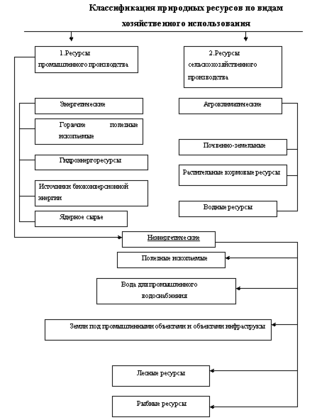 Среди классификаций природных ресурсов, отражающих их экономическую значимость и хозяйственную роль, особенно часто используется классификация по направлению и видам хозяйственного использования. Основной критерий подразделения ресурсов в ней - отнесение их к различным секторам материального производства или непроизводственной сферы. По этому признаку природные ресурсы делятся на ресурсы промышленного и сельскохозяйственного производства.