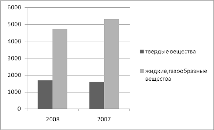 Соотношение твердых, жидких и газообразных загрязняющих веществ в общем валовом объеме выбросов в атмосферу за 2008/2007 годы (тн.) (Диаграмма № 2).