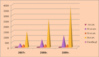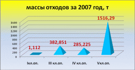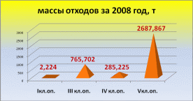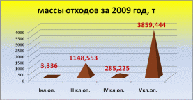 Как видно – большие объёмы принадлежат 2008 году. По классу опасности превалируют отходы 5 класса и за 2009 год их образовалось сравнительно больше, чем за предыдущие годы, их объёмы составили 3859,444 т.