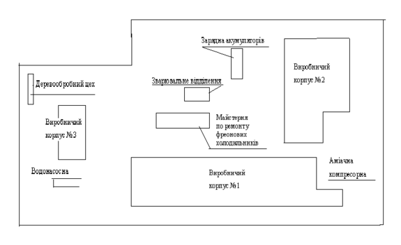 Як видно з рисунка основними стаціонарними джерелами викидів є виробничі корпуси, деревообробний цех, зварювальне відділення, Дільниця зарядки акумуляторів та майстерня по ремонту фреонових холодильників.