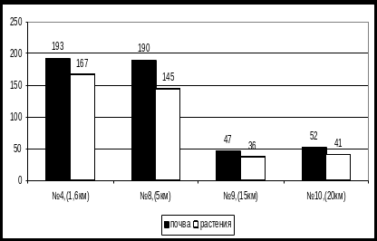 На гистограмме показано, что содержание поллютанта в изученных объектах снижается по мере удаления от источника эмиссии. Особое положение занимает мониторинговая площадка № 10, удаленная на расстояние 20 км от НчГРЭС, но испытывающая влияние дополнительных источников загрязнения. Территория площадки ограждёна двумя автомагистралями - Ростов-Москва с северо-западной стороны и Ростов-Новочеркасск с юго-восточной. В этой точке наблюдается возрастание содержания канцерогена во всех изучаемых объектах. Проведённые мониторинговые наблюдения показали, что даже значительно удалённые НчГРЭС территории могут содержать 3,4-бенз(а)пирен в концентрациях превышающих допустимые, причём преобладающим агентом загрязнения может являться не основной, а дополнительные источники эмиссии. Как наглядно демонстрирует гистограмма (рис.3), содержание изучаемого канцерогена в надземной части растительности не превышает его концентрацию в почве. Травянистая растительность, покрывающая почвенный покров изучаемых территорий, и обладающая развитой сорбционной поверхностью, накапливает загрязнённые вещества из атмосферных аэрозолей менее активнее почвы и, следовательно, содержит меньшее количество 3,4-бенз(а)пирена.