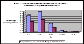 В проведенных исследованиях активность каталазы была максимальной при коэффициенте Zc концентрация загрязняющих веществ, равном 2 – 8, при Zc = 32 и более она практически не проявлялась.