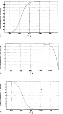 Расчеты показали, что все атомы хлора, содержащиеся в ПВХ, расходуются на образование хлороводорода. Основные продукты пиролиза — пироуглерод (графит), хлороводород НС1 и метан СН4, содержание которых зависит от температуры (рис. 1).