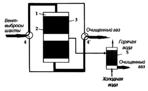 Для очистки газов от сероводорода предложен каталитический способ, основанный на селективном окислении H2S до серы (Пат. 2276097 РФ) [2]. В зависимости от концентрации сероводорода процесс осуществляют либо в адиабатических реакторах (при низких концентрациях 0,01— 5 об. % H2S), либо в реакторах с кипящим слоем катализатора (при высоких концентрациях (5-95 об.% H2S)). Обычно низкие концентрации сероводорода характерны для хвостовых газов процесса Клауса, а высокие концентрации присущи попутным нефтяным газам. В качестве примера на рис. 3 показаны две установки, одна из которых построена на ОАО "Омский НПЗ" для очистки хвостовых газов процесса Клауса (рис. 3, а), а другая — на нефтегазовых промыслах в Татарстане для очистки попутного газа (рис. 3, б). Одним из озон разрушающих газов является метан. Из всех выбросов метана в атмосферу на долю угольных шахт приходится 10%. При добыче угля часть метана извлекается путем дегазации пластов. Эти выбросы содержат метан с концентрацией от 30 до 70%. Такой газ может быть использован в стандартном теплоэнергетическом оборудовании. Однако объем его в выбросах угольных шахт составляет всего 15%. Гораздо сложнее использовать вентиляционные выбросы угольных шахт, которые содержат около 1% метана. Только угольные шахты Кузбасса в России выбрасывают в атмосферу ежегодно около 2 млрд. м3 метана. С целью реализации требований Киотского протокола можно предложить следующие каталитические процессы. Например, для переработки таких вентиляционных газов угольных шахт можно использовать реверс-процесс (рис. 4) [3]. В настоящее время основная проблема заключается в создании первой демонстрационной установки на одной из шахт России.