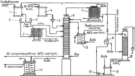 Технологическая схема концентрирования азотной кислоты с применением серной кислоты показана на рисунке 1.2.
