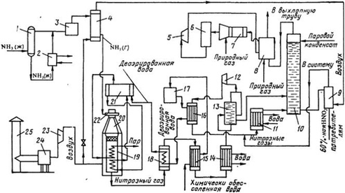 Очищенный воздух и аммиак поступают в смесительную камеру 22 контактного аппарата 20. Образующаяся аммиачно-воздушная смесь содержит 9,6–10,0% NH3. Пройдя тонкую очистку в фильтре, встроенном в контактный аппарат, аммиачно-воздушная смесь поступает на двухступенчатый катализатор, состоящий из трех платиноидных сетоь и слоя неплатинового катализатора. Нитрозные газы при температуре 840–860 °С поступают в котел-утилизатор 19, расположенный под контактным аппаратом, где за счет их охлаждения получают пар давлением 40 МПа с температурой 440 °С. Котел питают химически очищенной водой, деаэрированной в колонне 17. Деаэрированная вода проходит теплообменник 16, где нагревается нитрозными газами до 150 °С, экономайзер 18 и затем поступает в барабан котла-утилизатора 21.
