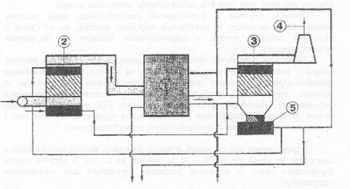 Нагретая в экономайзере вода собирается в поддоне и насосом подается частично на водораспределитель контактного воздухоподогревателя, откуда поступает на насадку контактной камеры, где при непосредственном контакте с холодным воздухом охлаждается и стекает в поддон. Остальная часть нагретой воды насосом подается через промежуточный теплообменник на систему защиты от обмерзания, а оттуда сливается в поддон. В теплообменнике происходит нагрев воды, подаваемой на внешние потребители (химводоочистку, систему горячего водоснабжения и т.п.). Охлажденная вода из поддона воздухоподогревателя через патрубки с гидрозатворами, соединенными с водораспределителем, подается для нагрева на насадку контактной камеры экономайзера.