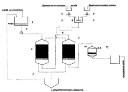 Приготовление сорбента осуществляется следующим образом. В емкость 4 подаются увлажненные водой опилки, которые с помощью ковшового дозатора 5 загружаются в емкость для приготовления сорбента 8, куда также подается бентонитовая глина из емкости 9. В емкости 8 материалы перемешиваются, направляются на спекание в печь 6, затем в фильтр 3 на поддерживающую сетку. Удаление использованной загрузки осуществляется гидротранспортом из верхней части фильтра. Отработанный сорбент собирается в отстойнике 7, где обезвоживается. Вода возвращается в усреднитель, а опилки утилизируются после трехкратной регенерации сжиганием.