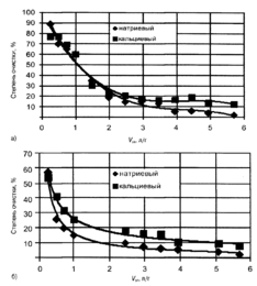 Данные, полученные при очистке растворов от ионов цинка, свидетельствуют о том, что степень очистки также достаточно велика при пропускании первых порций раствора (см. рис. 3, б). Однако более резкое снижение эффективности (до 20 %) наблюдается при пропускании удельного объема 1,5 л/г для сорбента с кальциевым бентонитом и 0,8 — для сорбента с натриевым бентонитом.