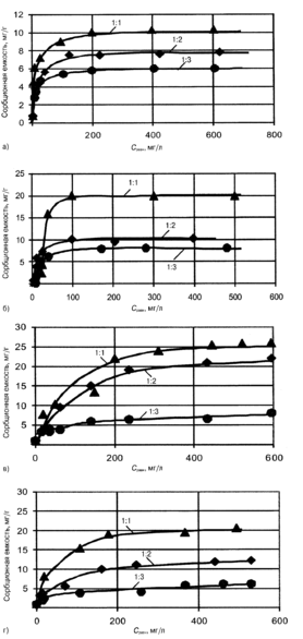 В отличие от ионов меди извлечение ионов цинка "Беномом" с кальциевым бентонитом происходит менее эффективно (см. рис. 2, г): максимальная сорбционная емкость при соотношении бентонит:опилки 1:1 и 1:2 составляет 20 и 12 мг/г.