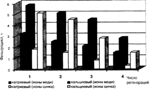 Исследовали водные растворы сульфатов меди и цинка с концентрацией 50 мг/л, что соответствует средней концентрации промывных вод процессов меднения и цинкования. Скорость фильтрования раствора поддерживалась постоянной (3 — 5 м/ч).