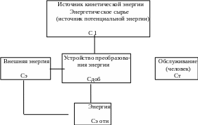 Как видно из рисунка, на устройство преобразования энергии поступает потенциальная или кинетическая энергия, которая затем преобразуется в нужную нам форму. Отличия источников энергии определяют необходимость добычи соответствующего сырья, например, нефти, угля, газа и т.д., либо использования устройства преобразования, размещенного непосредственно в кинетической среде. Например, гидроэлектростанции, приливные, ветряные и т.п. источники энергоснабжения. Это ведет к изменению состава экономического цикла воспроизводства, но не меняет существа работы технологического цикла.
