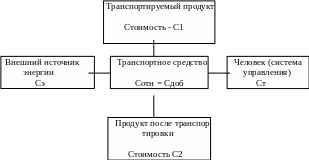 Хотя на первый взгляд функционально транспортный технологический цикл труда внешне очень похож на те, которые мы рассматривали в первых двух сферах труда, он коренным образом отличается от них. Дело в том, что транспортное средство не является орудием труда в том смысле, что оно не совершает никаких преобразований транспортируемого продукта, не использует вторичной информации для создания первичной, а потому информация на входе и на выходе цикла остается неизменной, а это означает, что С1 = С2.