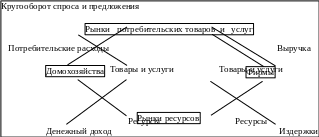 Кругооборот спроса и предложения может быть конкретизирован с учетом ресурсов, потребительских благ и доходов. Спрос домохозяйств выражается в расходах, которые осуществляются на рынках потребительских благ и услуг. Продажа этих благ и услуг составляют выручку фирмы. Покупка ресурсов, необходимых для этого, предполагает издержки фирмы. Домохозяйства, поставляя необходимые ресурсы (капитал, труд, землю, предпринимательскую способность), получают денежные доходы (заработную плату, ренту, проценты, прибыль). Таким образом реальный поток экономических благ дополняется встречным денежным потоком доходов и расходов.