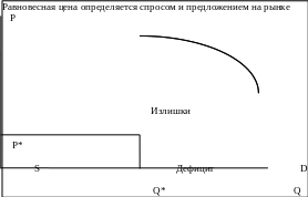 Избыточный спрос или дефицит сопутствующий ценам ниже цены равновесия свидетельствует, что покупателям необходимо платить более высокую цену, чтобы не остаться без продукта. Растущая цена будет 1) побуждать фирмы к перераспределению ресурсов в пользу производства данного товара и 2) вытеснять некоторых потребителей с рынка.