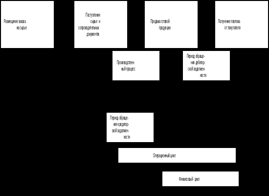 Логика представленной схемы заключается в следующем. Операционный цикл характеризует общее время, в течение которого финансовые ресурсы омертвлены в запасах и дебиторской задолженности. Поскольку предприятие оплачивает счета поставщиков с временным лагом, время, в течение которого денежные средства отвлечены из оборота, т. е. финансовый цикл, меньше на среднее время обращения кредиторской задолженности. Сокращение операционного и финансового циклов в динамике рассматривается как положительная тенденция. Если сокращение операционного цикла может быть сделано за счет ускорения производственного процесса и оборачиваемости дебиторской задолженности, то финансовый цикл может быть сокращен как за счет данных факторов, так и за счет некоторого некритического замедления оборачиваемости кредиторской задолженности.