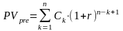 Логика оценки денежного потока в этом случае аналогии вышеописанной; некоторое расхождение в вычислительных формулах объясняется сдвигом элементов потока к началу соответствующих подынтервалов. Для прямой задачи приведенная стоимость потока пренумерандо в общем виде может быть рассчитана по формуле: