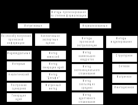 В существующих источниках представлены различные классификационные принципы методов прогнозирования. Одним из наиболее важных классификационных признаков методов прогнозирования является степень формализации, которая достаточно полно охватывает прогностические методы. Вторым классификационным признаком можно назвать общий принцип действия методов прогнозирования, третьим – способ получения прогнозной информации. На рис. 1.1 представлена классификационная схема методов прогнозирования. [10, с. 31]
