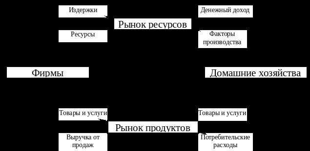 Из схемы, представленной на рис. 2.1, видно, что экономика является замкнутой системой. Потоки «доходы – расходы» и «ресурсы – продукция» осуществляются одновременно в противоположных направлениях и бесконечно повторяются. Основным выводом из модели является равенство общего объема производства в денежном выражении суммарной величине денежных доходов домашних хозяйств.
