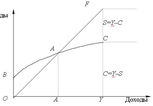 В начале потребительские расходы обеспечиваются как за счет текущего дохода, так и за счет прошлых сбережении («проедания» ранее накопленных средств и запасов). В точке A сбережения равны нулю. После достижения этого рубежа часть дохода начинает откладываться в виде сбережении S. Теперь потребление растет, несколько отставая от роста дохода.