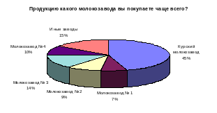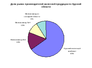 Ответ: Наши конкуренты все вместе занимают на рынке молочных изделий столько, сколько наш комбинат. (см. График №1) Причем в соотношении 8+8+14+10. Претендовать на наше место они смогут лишь объединившись. Также солидную долю рынка отхватил молокозавод из соседней области (20%). С ним придется бороться.