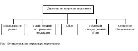 Структура функционального типа целесообразна для предприятий, у которых количество товаров и рынков невелико. В этом случае рынки и производимые товары рассматриваются как однородные, для работы с которыми создаются специализированные отделы. На рис.1 представлена схема службы маркетинга, организованной по функциям. Кроме указанных подразделений, в службе маркетинга могут быть созданы отделы: планирования маркетинга, управления товародвижением, новых товаров. Функциональная организация маркетинга базируется на разделении труда по установившимся и вновь возникающим функциям, на специализации работников. При небольшой номенклатуре выпускаемой продукции функциональная организация маркетинга обладает высокой маневренностью благодаря простоте управления. Однако при расширении номенклатуры выпускаемой продукции производственная маневренность снижается, поскольку возрастает период реакции на изменение внешних условий. Функциональную структуру маркетинга характеризует слабая гибкость стратегии, так как она ориентирует на достижение текущего эффекта, а не на внедрение нововведений. Подобная структура маркетинговой деятельности не способствует динамизму и новаторству. В целом же такая структура является эффективной формой организации только при устойчивом производстве ограниченного ассортимента изделий. Функциональная маркетинговая структура выступает базовой для остальных форм.