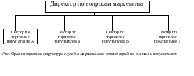 Для предприятий, продающих свою продукцию на разных рынках, где наблюдаются неодинаковые товарные предпочтения, а товары требуют специфического обслуживания, целесообразна организация маркетинга по рынкам (рис.3). Рынком может выступать отрасль промышленности либо сегмент однородных покупателей. Введение должности управляющего по рынку ставит запросы покупателей в центр внимания. Основные рынки закрепляются за управляющими по рынкам, последние сотрудничают со специалистами функциональных подразделений в разработке планов по различным направлениям функциональной деятельности. Для каждого рынка должна быть выработана своя стратегия маркетинга.