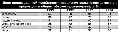 В период 1992-1997 гг. отношение потребления продуктов в натуральной форме к покупке товаров возросло с 7 до 15-16%. По ряду важнейших видов продуктов питания производство в личных подсобных хозяйствах сыграло определяющую роль в поддержании потребления. Так, доля картофеля, производимого в хозяйствах населения, в общем объеме его производства возросла с 1990 по 1996-1997 гг. с 66 до 90-91%, овощей - с 30 до 76-77%, мяса - с 25 до 52-56%, молока - с 24 до 45-47%. Причем основная часть этой продукции потреблялась в самих домашних хозяйствах: уровень товарности производимых в хозяйствах населения картофеля, овощей, мяса и молока в 1996-1997 гг. составил соответственно 10, 9-10, 23, 18% (для сравнения: 1991 г. - 29, 17, 30, 25%).