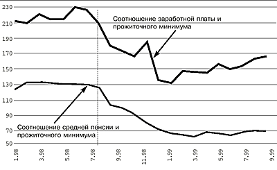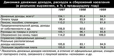 В результате одновременно с падением реальных доходов сузилась и государственная социальная поддержка населения. Ее доля по отношению к денежным доходам населения упала с 21-22% в 1996-1997 гг. до 17% в 1999 г. Кризис государственных финансов актуализирует проблему переноса бремени финансирования социальной инфраструктуры на само население, что крайне негативно скажется на уровне жизни.