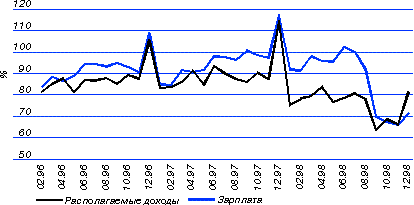 Денежные доходы на душу населения в 1998 г. составили 970 руб., увеличившись по сравнению с предыдущим годом на 3.8% в номинальном выражении. Реальные доходы населения сократились на 18.2% (в 1997 г. реальные денежные доходы выросли на 22.4%). Таким образом, дефлятор по денежным доходам в 1998 г. составил 126.9. В структуре денежных доходов возросла доля заработной платы и доходов от предпринимательской деятельности, при этом снизилась доля социальных трансфертов за счет роста задолженности по выплате пенсий и пособий на детей.