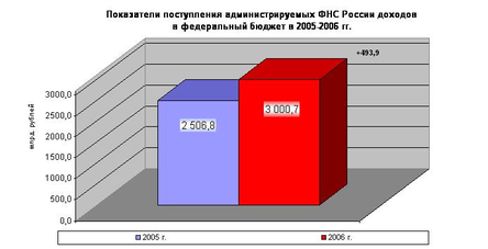 В 2006 году в федеральный бюджет страны поступило администрируемых ФНС России доходов 3 000,7 млрд. рублей, что на 493,9 млрд. рублей, или на 19,7% больше, чем за 2005 год24, что показано на рисунке 1.