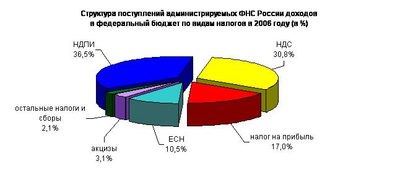 Поступления налога на прибыль организаций в федеральный бюджет Российской Федерации в 2006 году составили 509,9 млрд. рублей. По сравнению с 2005 годом они выросли на 146,3 млрд. рублей, или в 1,4 раза. Поступления единого социального налога, зачисляемого в федеральный бюджет, в 2006 году составили 315,8 млрд. рублей и выросли по сравнению с 2005 годом на 18,1%. Поступления налога на добавленную стоимость на товары (работы, услуги), реализуемые на территории Российской Федерации, в 2006 году составили 924,2 млрд. рублей и по сравнению с 2005 годом выросли на 36,2 млрд. рублей, или на 4,1%. Суммы, фактически возмещенные налогоплательщикам по налоговой ставке 0 процентов, в 2006 году (по предварительным данным) составили 708,3 млрд. рублей, что в 1,3 раза больше, чем в 2005 году. Налога на добавленную стоимость на товары, ввозимые на территорию Российской Федерации из Республики Беларусь, поступило в 2006 году 27,2 млрд. рублей, что на 6,3 млрд. рублей, или в 1,3 раза больше, чем в 2005 году. Поступления по сводной группе акцизов в федеральный бюджет составили в 2006 году 93,2 млрд. рублей и выросли относительно 2005 года на 16,5%. Поступления акцизов на спирт этиловый из всех видов сырья и спиртосодержащую продукцию в федеральный бюджет Российской Федерации в 2006 году составили 4,1 млрд. рублей, или на 14,0% больше, чем в 2005 году. В федеральный бюджет в 2006 году мобилизовано акцизов на табачную продукцию, производимую на территории Российской Федерации, 35,5 млрд. рублей, что на 22,8% больше поступлений 2005 года. Поступления акцизов на нефтепродукты (бензин автомобильный, дизельное топливо и моторные масла) в федеральный бюджет в 2006 году составили 50,1 млрд. рублей и относительно 2005 года выросли на 9,3%. Налога на добычу полезных ископаемых (далее – НДПИ) в 2006 году поступило в федеральный бюджет 1 094,3 млрд. рублей, в том числе на добычу нефти – 986,5 млрд. рублей, на добычу газа горючего природного – 89,9 млрд. рублей; на добычу газового конденсата из всех видов месторождений – 7,2 млрд. рублей. По сравнению с 2005 годом поступления НДПИ выросли в 1,3 раза. Страховых взносов, зачисляемых в Пенсионный фонд Российской Федерации, поступило 796,2 млрд. рублей, что на 25,6% больше, чем в 2005 году.