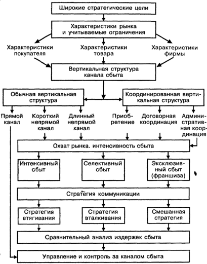Таким образом, структура канала сбыта зависит от распределения обязанностей между его участниками. Вертикальная структура канала характеризуется числом уровней, отделяющих производителя от конечного пользователя (без посредников, с одним или несколькими посредниками). С точки зрения производителя, чем длиннее канал, тем труднее его контролировать. Фирма обычно прибегает к использованию нескольких каналов сбыта либо с целью создать конкурентную ситуацию, соперничество между торговцами, либо с целью выхода на несколько сегментов, характеризующихся различными покупательскими предпочтениям.