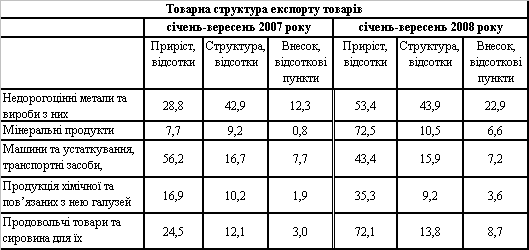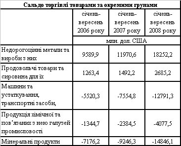 Визначальний вплив на формування від’ємного сальдо торгівлі товарами здійснило збільшення негативного сальдо торгівлі за групами: машини та устаткування, транспортні засоби та прилади (до $12,8 млрд.), мінеральні продукти (до $14,9 млрд.) та продукції хімічної промисловості (до $4,1 млрд.), незважаючи на зростання додатного сальдо у торгівлі недорогоцінними металами та виробами з них (до $18,3 млрд.). Обсяги експорту товарів зазначеної групи (питома вага – 43,9%) протягом січня-вересня зростали завдяки сприятливій зовнішньо-економічній кон'юнктурі на світовому ринку металопродукції. Так, протягом січня-липня світові ціни на металопродукцію стрімко зростали (83,1%), внаслідок чого, незважаючи на незначне збільшення фізичних обсягів експорту металопродукції (близько 8%), відбулося збільшення вартісних обсягів експорту (на 54,5%). Проте надалі, після досягнення пікового значення у середині липня (станом на 11.07.08 – 84,6%), на тлі розгортання рецесійних процесів у світовій економіці та скорочення попиту на світовому ринку металопродукції, протягом серпня-вересня розпочалось зниження цін (станом на 31.09.08 – на 12,3%). Саме скорочення світового попиту та цін у серпні-вересні призвело до затоварювання складів основних вітчизняних виробників металопродукції та до скорочення виробництва. Зазначене призвело до того, що, незважаючи на збільшення кумулятивних темпів зростання експорту металопродукції за підсумками 9 місяців на 53,4%, помісячні темпи зростання у серпні-вересні (60,6% та 45,5%) суттево уповільнілись у порівнянні з липнем (90,3%).