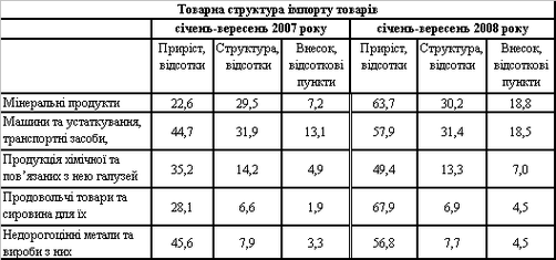 1) зростання внутрішнього споживчого попиту на товари повсякденного вжитку та довготривалого користування, яке стимулювалося підвищення доходів населення (на 13%), ростом обсягів споживчого кредитування (на 33,7%), ревальвацією гривні відносно долара та лібералізацією імпорту через набуття членства у СОТ (зазначене призвело до зростання обсягів імпорту легкових автомобілів у 1,8 раза (обсяги імпорту за товарною групою "Машини та устаткування, транспортні засоби та прилади" збільшились на 57,9% у порівнянні з відповідним періодом 2007р.) та зростання імпорту продовольчих товарів та сировини для їх виробництва (67,9%, питома вага – 6,9%); 2) активізація інвестиційного імпорту; 3) зростання вартісних обсягів імпорту мінеральних продуктів на 63,7% (за товарною групою "Енергетичні матеріали, нафта та продукти її перегонки" від’ємне сальдо становило $15 млрд. при питомій вазі 27% в імпорті товарів).