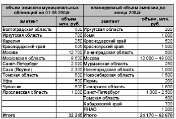 С учетом пока не реализованных полностью выпусков облигаций Саха (Якутии) и Уфы, а также доразмещений ГИО Санкт-Петербурга общий объем облигаций, выставленных на аукционную продажу в январе-июле 2004 года, составил 32,245 млрд. руб.
