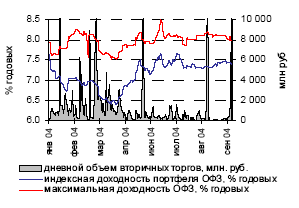 В первой половине 2004 года на рынке ГКО-ОФЗ произошли изменения. Доходность государственных бумаг в течение первого квартала снижалась и к середине апреля достигла беспрецедентно низких значений. Определяющим фактором такой динамики была валютная политика денежных властей России — постоянное укрепление курса рубля к мировым валютам вызывало приток дополнительных средств из-за рубежа. В то же время внутри страны устойчивый спрос на государственные ценные бумаги предъявляли институциональные инвесторы — пенсионные фонды, страховые компании, крупные банки с государственным участием. В середине апреля ситуация резко изменилась. Изменение валютной политики Центробанка совпало с ожиданиями повышения учетной ставки Федеральной резервной системы США. Нерезиденты покинули внутренний долговой рынок России. Отечественных инвесторов не устроил уровень доходности связи с ожидаемой инфляцией. В результате интерес к покупке государственных бумаг исчез и процентные ставки начали быстро расти. Отметим, что ни летний банковский кризис, ни падение российского рынка акций не отразились негативно на рынке ГКО-ОФЗ.