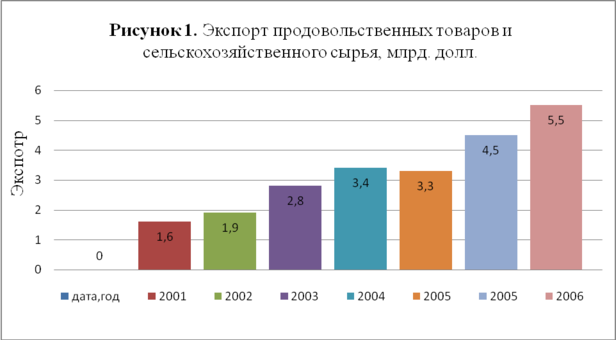 АПК играет всё более активную роль на внешнем рынке. Экспорт сельскохозяйственной продукции и продовольствия достиг более 5 млрд. долл. (Рисунок 1) [13.C.19.].