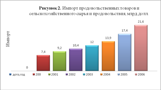 Проблемы на селе, прежде всего, связаны с невысокой доходностью сельскохозяйственных товаропроизводителей в условиях сохраняющегося диспаритета цен, низкой производительности и оплаты труда, недостатка финансовых ресурсов для освоения новейших технологий, высокой доли импортной продукции, а также ненадлежащего состояния социальной сферы. Если в 2005 году цены на сельскохозяйственную продукцию выросли на 9,6%, то на промышленную – на 15,7%. Аналогичная ситуация сохранилась и в 2006 году. Так цены на реализованную сельскохозяйственную продукцию по сравнению с 2005 годом увеличились на 10%, а на промышленную – на 21%. Диспаритет цен ещё более углубился. В результате, ежегодно из сельского хозяйства изымается до 80 млрд. руб. Сдерживающим фактором развития отечественного производства является рост объёмов импорта сельскохозяйственной продукции и продовольствия. По данным таможенной статистики, в 2006 году объём импорта продовольственных товаров и сельскохозяйственного сырья для их производства составил21,6 млрд. долл., или вырос по сравнению с 2005 годом на 24% (Рисунок 2) [13.C.20.].