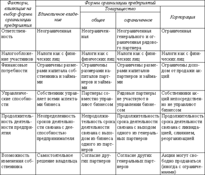 Таблица 1. Сравнительная характеристика форм организации предприятий