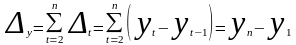 За весь период, описываемый рядом, абсолютный прирост () выразится как алгебраическая сумма частных приростов или, что очевидно, как разность между последним уровнем ряда и первым его уровнем: