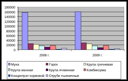 По диаграмме рисунка 4 видно, что в 2009 году незначительно увеличивается выпуск муки, крупы гречневой и гороха. Незначительно уменьшается выпуск крупы манной, крупы ячневой, комбикорма, концентрата кормового. Значительно (на 1/3) уменьшился объем отрубей пшеничных.