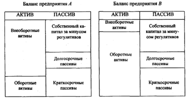 Безусловно, коэффициенты, рассчитанные по пассиву баланса, являются основными в этом блоке анализа финансового состояния, однако характеристика финансовой устойчивости с помощью таких показателей вряд ли будет полной - важно не только то, откуда привлечены средства, но и куда они вложены, какова структура вложений с позиции долгосрочной перспективы. Это легко видеть, сравнивая балансы компаний А и В, имеющих абсолютно одинаковую структуру пассивов, но разную структуру активов (рис. 1.1).